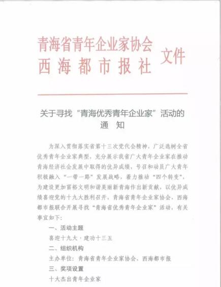 為深入貫徹落實(shí)省第十三次黨代會(huì)精神,廣泛選樹全省優(yōu)秀青年企業(yè)家典型,充分展示我省廣大青年企業(yè)家在推動(dòng)青海經(jīng)濟(jì)社會(huì)發(fā)展中取得的優(yōu)異成績,號(hào)召和動(dòng)員廣大青年積極融