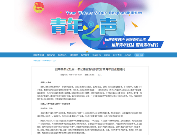 10月20日,團(tuán)中央書記處第一書記秦宜智通過(guò)“青年之聲”互動(dòng)社交平臺(tái)回答網(wǎng)友提問(wèn)。網(wǎng)頁(yè)截圖 中國(guó)青年網(wǎng)北京10月20日電(記者 劉妍彤) “我為你們的青春夢(mèng)想喝彩