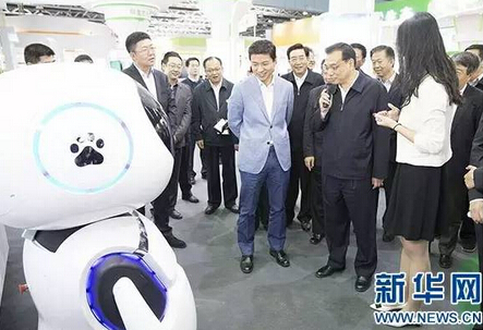 10月19日,中共中央政治局常委、國(guó)務(wù)院總理李克強(qiáng)在北京出席首屆“全國(guó)大眾創(chuàng)業(yè)萬(wàn)眾創(chuàng)新活動(dòng)周”,并考察主題展區(qū)。這是李克強(qiáng)在與百度公司自主研發(fā)的機(jī)器人交談。